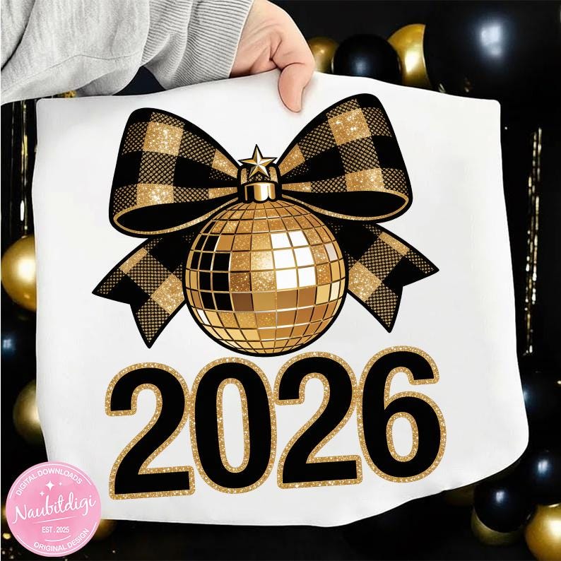 Celebrate the New Year in style with this elegant 2026 sweatshirt featuring a gold disco ball and bow design. Perfect for New Year outfits, gifts, and festive celebrations.