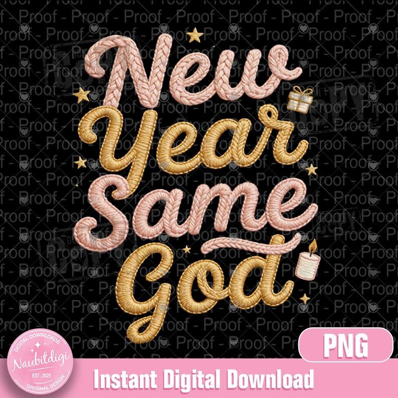 Faith-inspired New Year PNG design featuring elegant embroidered-style lettering with the message “New Year Same God.” Perfect for Christian apparel, sublimation, DTF printing, and meaningful New Year gift creations.