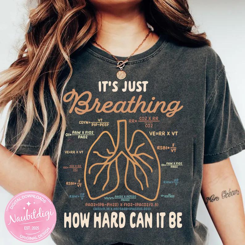 High-quality digital PNG designs for sublimation and DTF, featuring funny respiratory therapist medical humor like the “It’s Just Breathing” lungs design.
