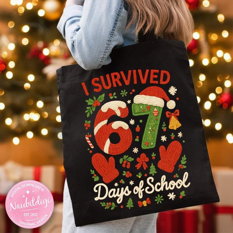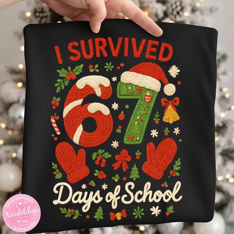 Bring some festive laughs to the classroom with this cozy faux-yarn “I Survived 67 Days of School” design! Styled with warm knitted textures and playful Christmas elements, this graphic is perfect for anyone who has barely made it through the school year and wants to celebrate with holiday humor.