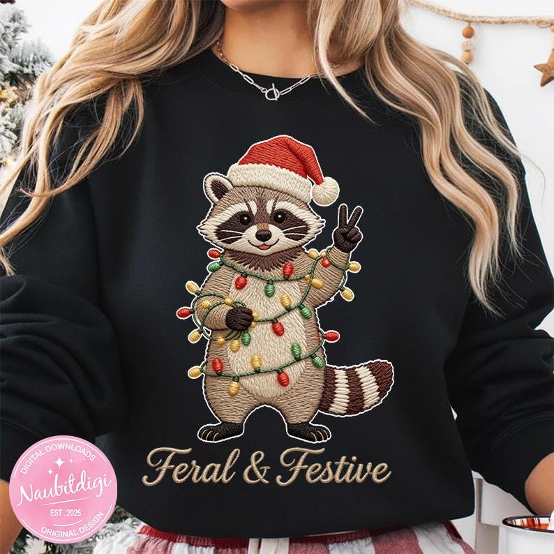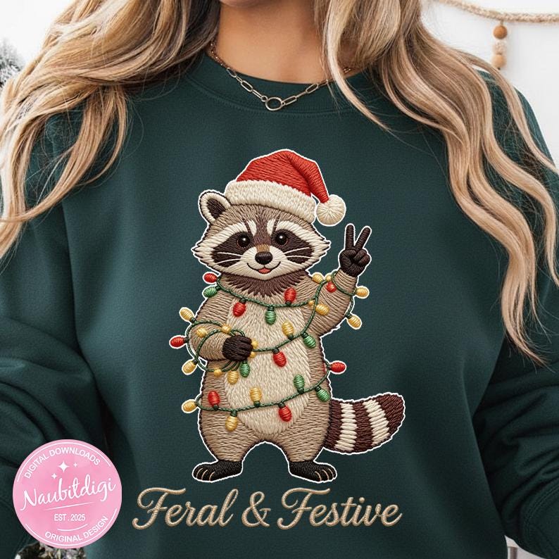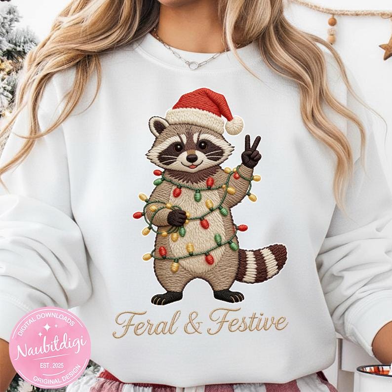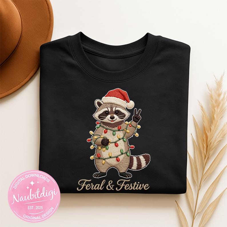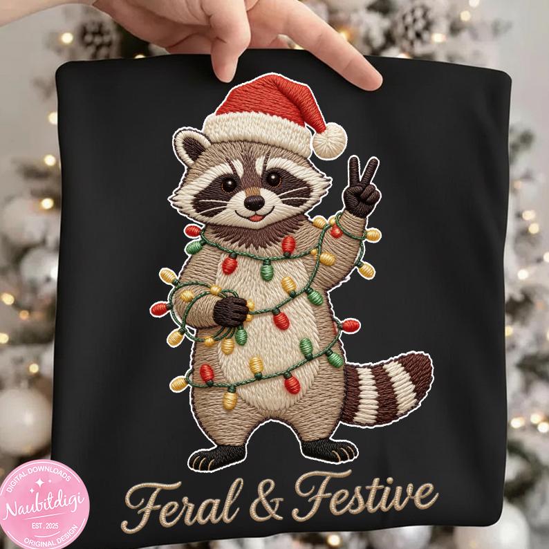 Feral & Festive Christmas Raccoon PNG – Embroidered Style Funny Holiday Animal Sublimation Design