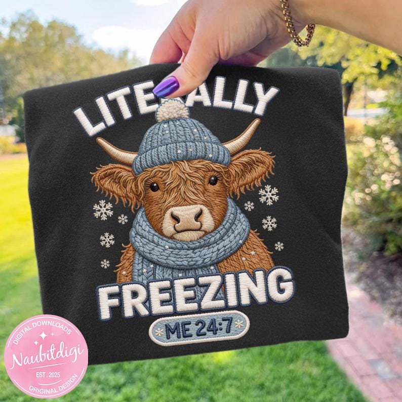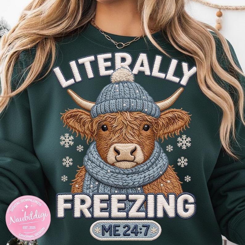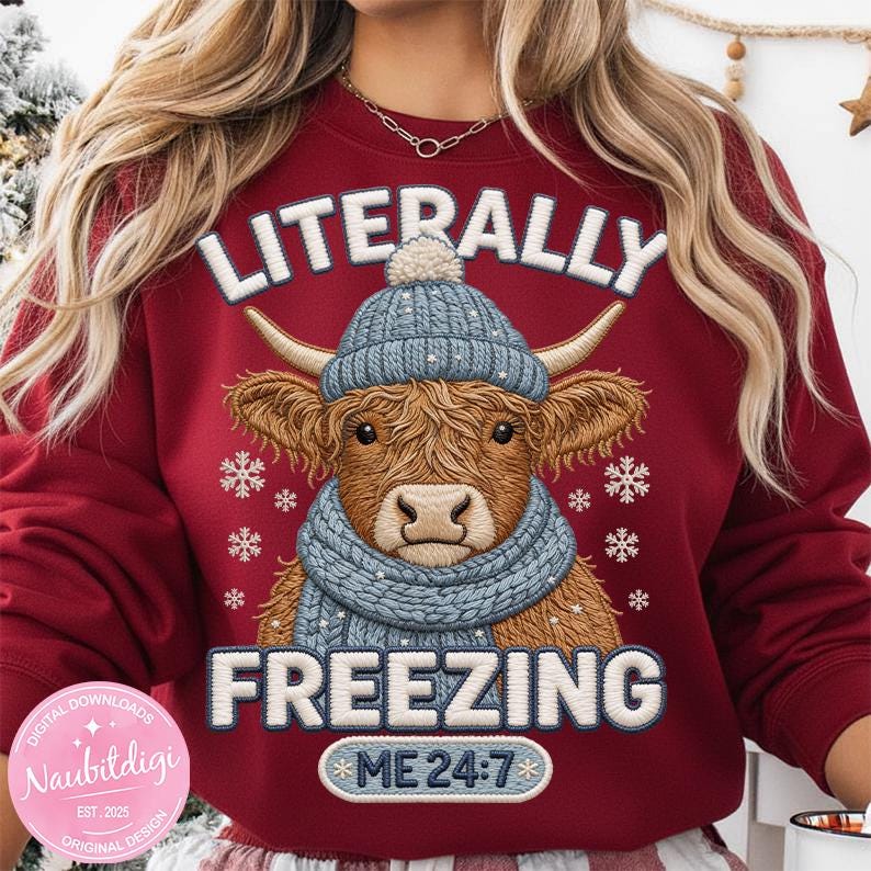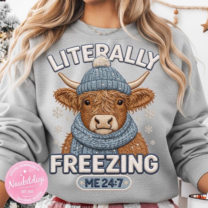Bring cozy winter charm to your projects with this Literally Freezing Highland Cow PNG, featuring an adorable cow in a knitted hat and scarf with embroidered-style lettering. Perfect for winter shirts, holiday gifts, cold-weather humor designs, mugs, sweatshirts, and seasonal crafts.