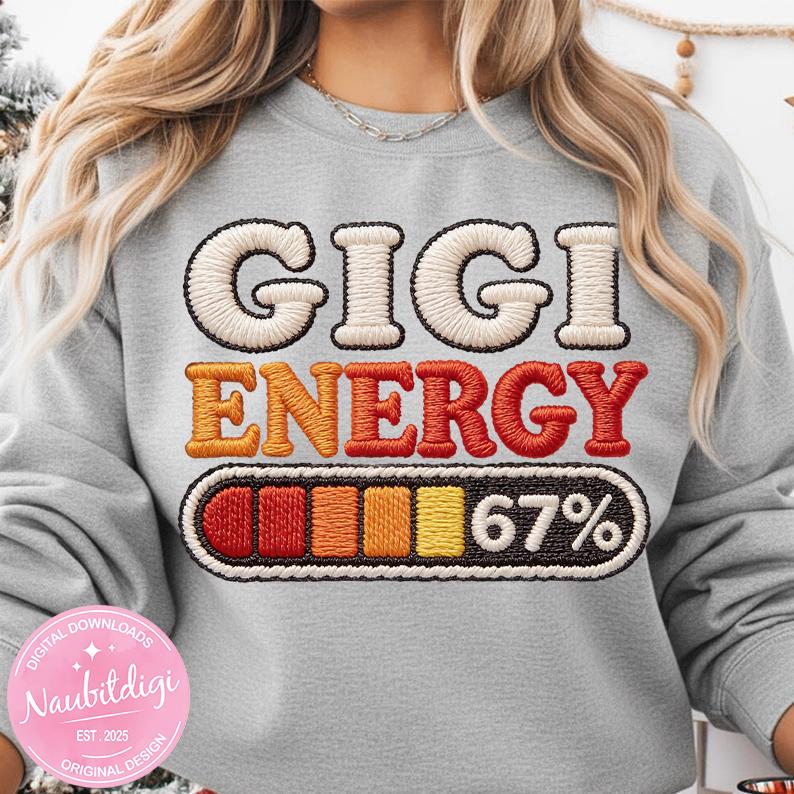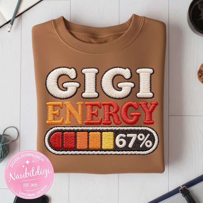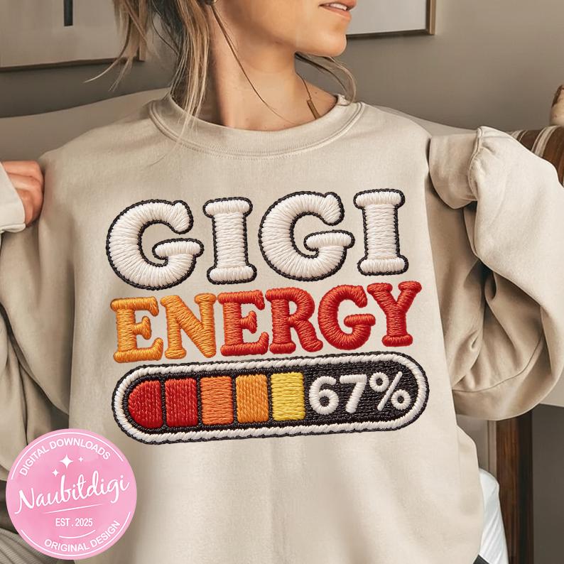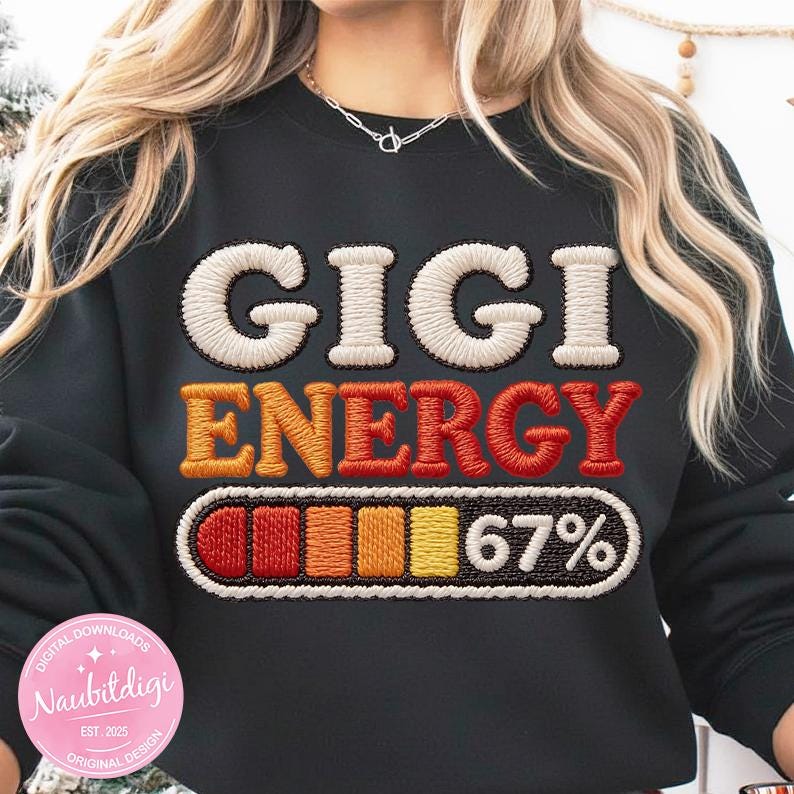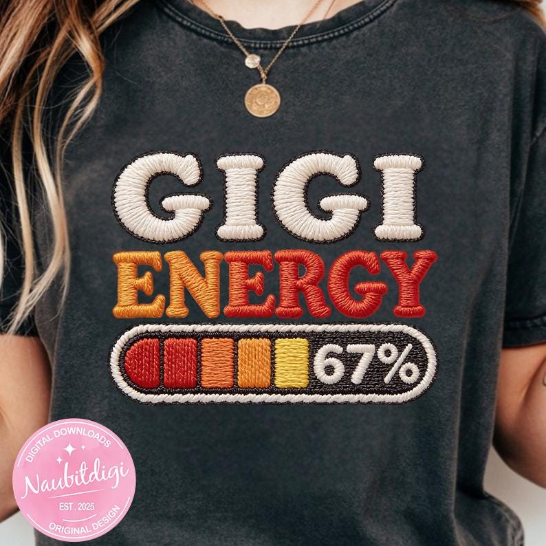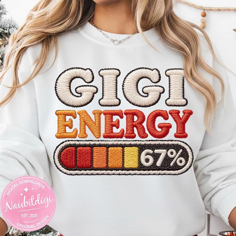 Gigi Energy 67% PNG Retro Embroidered Design, Funny Gigi Mothers Day Gift, Vintage Gigi Sublimation Download