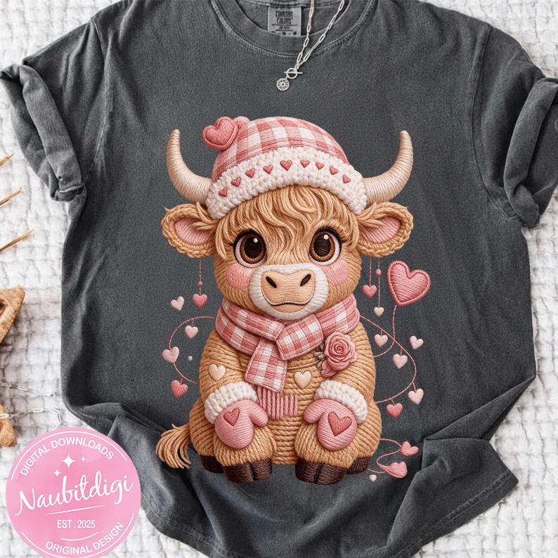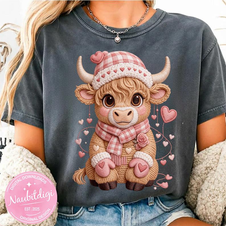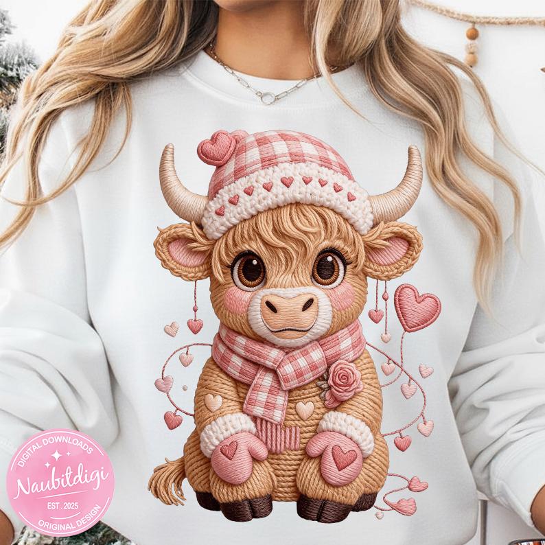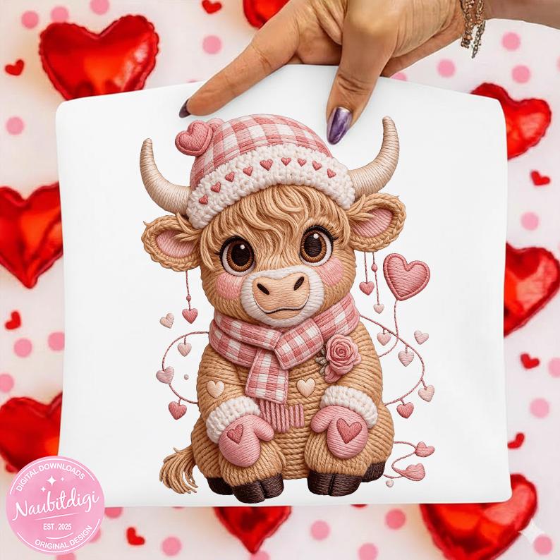 Valentine Highland Cow PNG, Cute Cow with Hearts & Winter Outfit, Valentine Sublimation Design, Farm Animal PNG, Pink Embroidery Cow Clipart