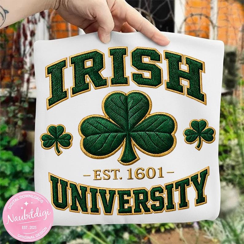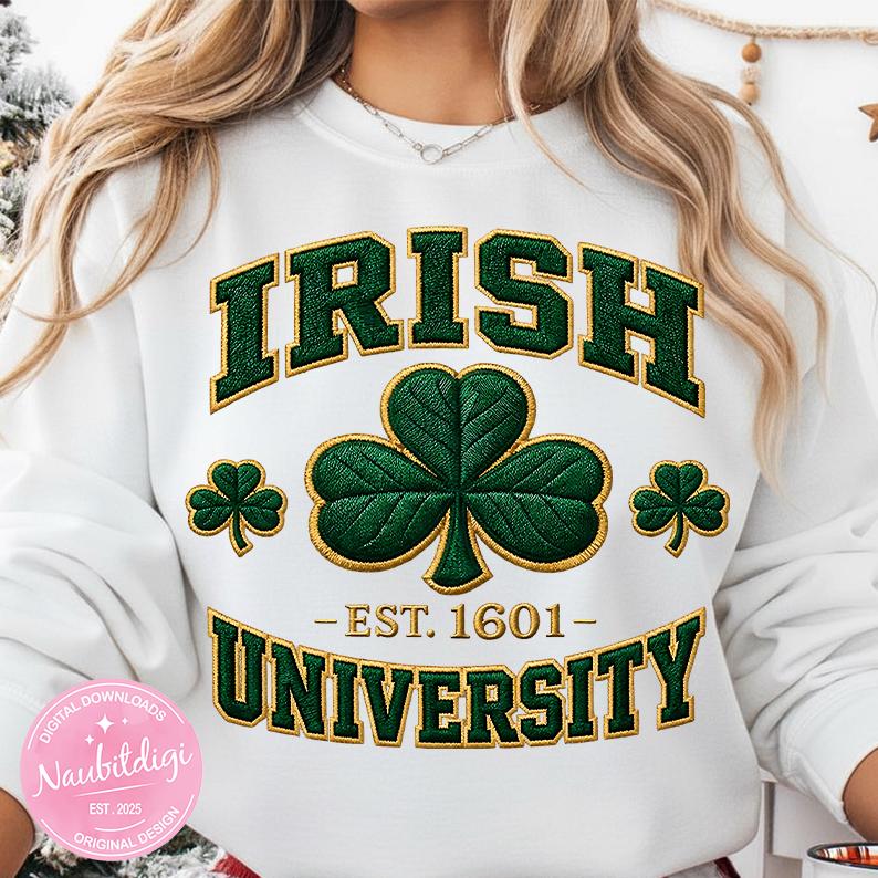 Stand out on parade day with this St Patrick’s Day PNG an Irish University collegiate design with a bold shamrock. High-resolution transparent PNG perfect for sublimation or DTF on matching family tees, spirit wear, and Irish pride outfits.