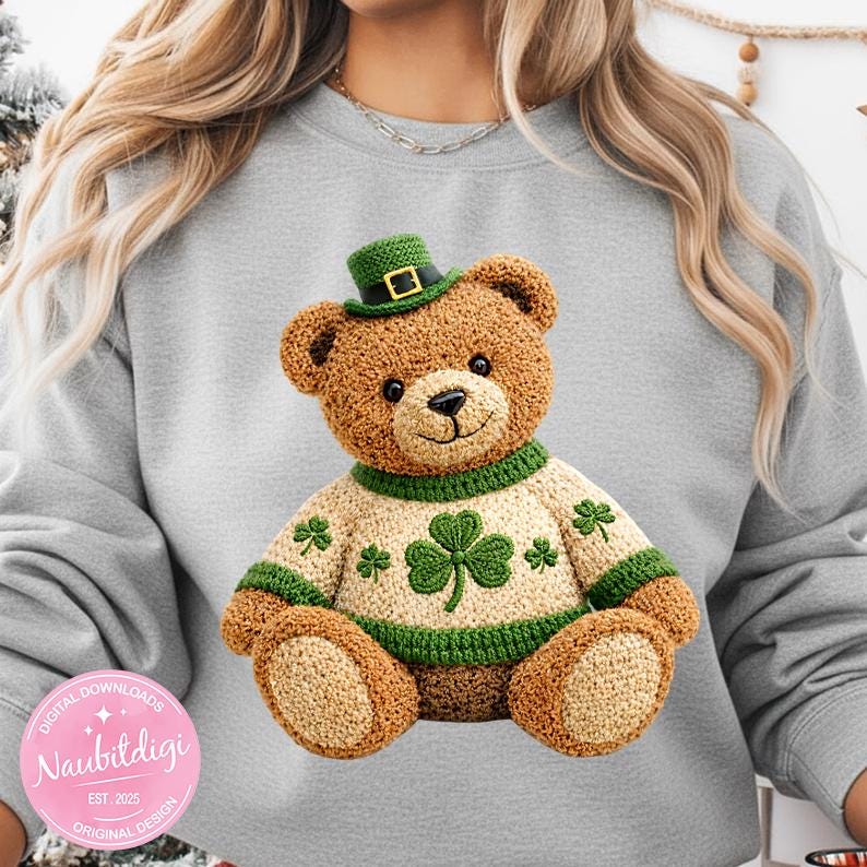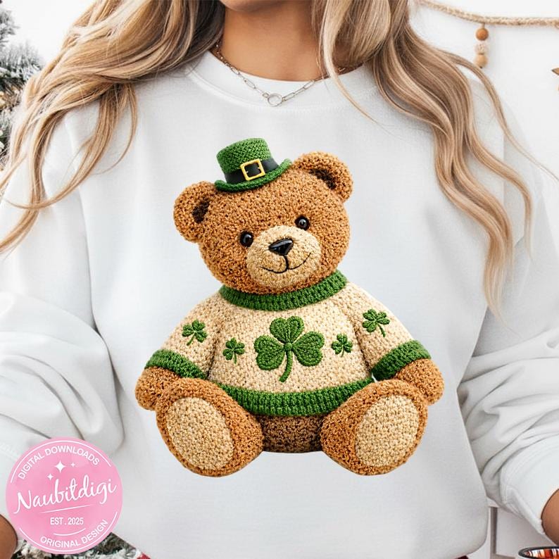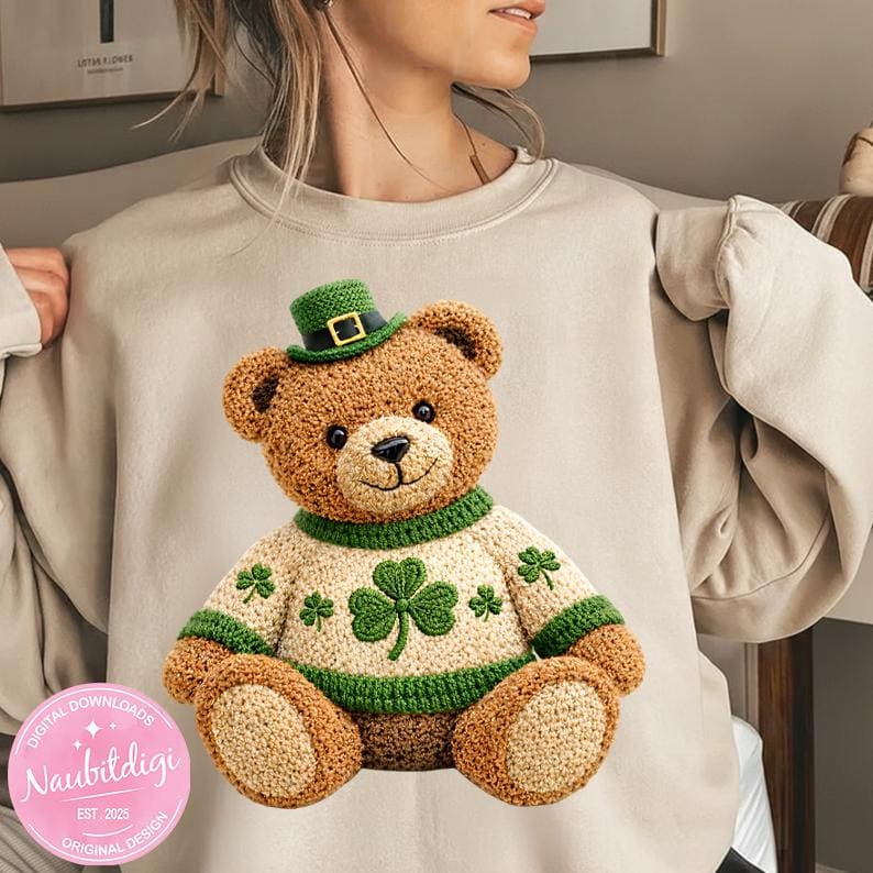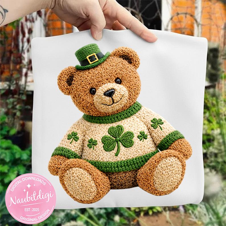 This artwork features a cozy, luxury crochet-style teddy bear wearing a festive sweater with a stitched three-leaf shamrock (clover) at the center, inspired by classic Irish aesthetics.