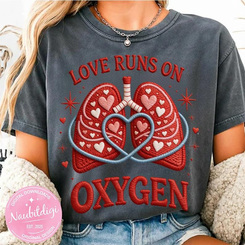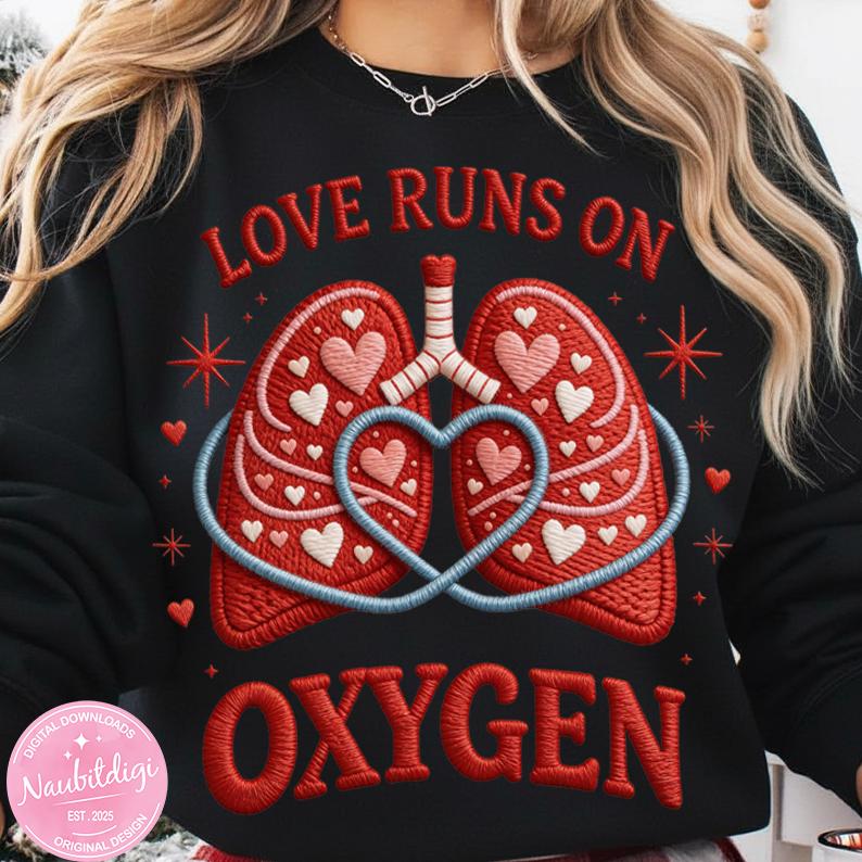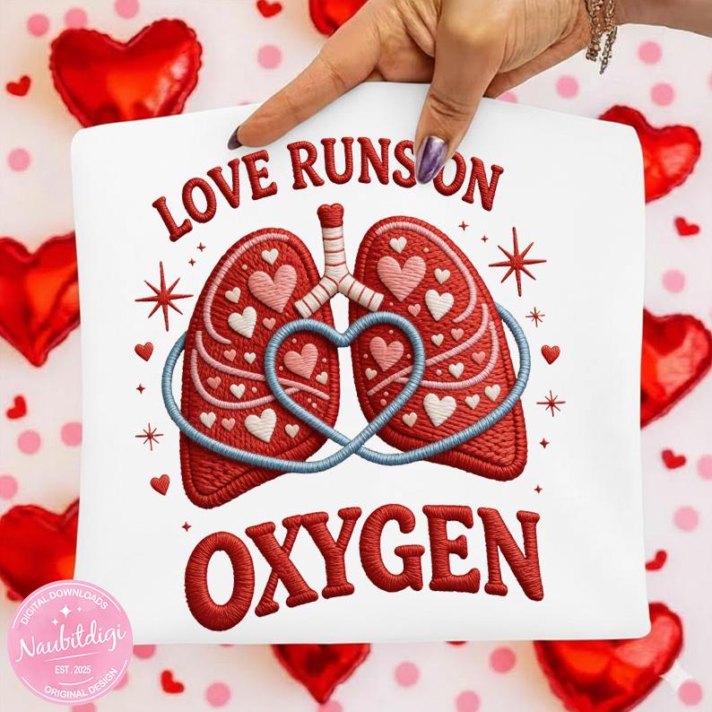 Celebrate love and healthcare pride with this Respiratory Therapist Valentine’s Day PNG design featuring embroidered-style lungs filled with hearts and the bold phrase “Love Runs on Oxygen.”