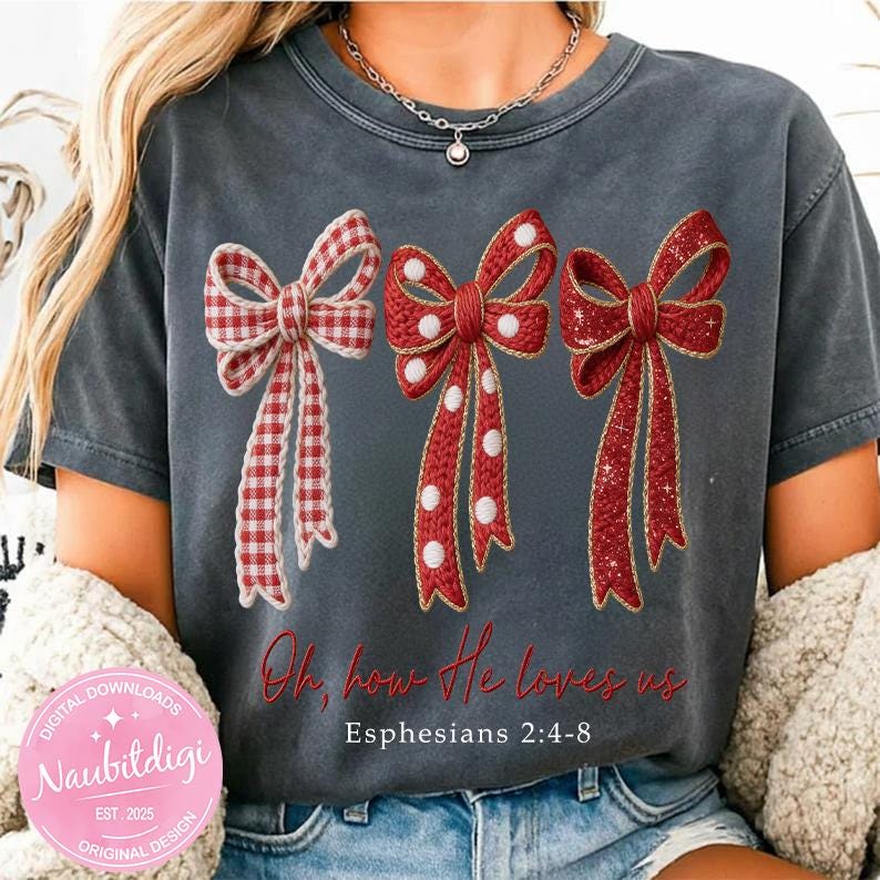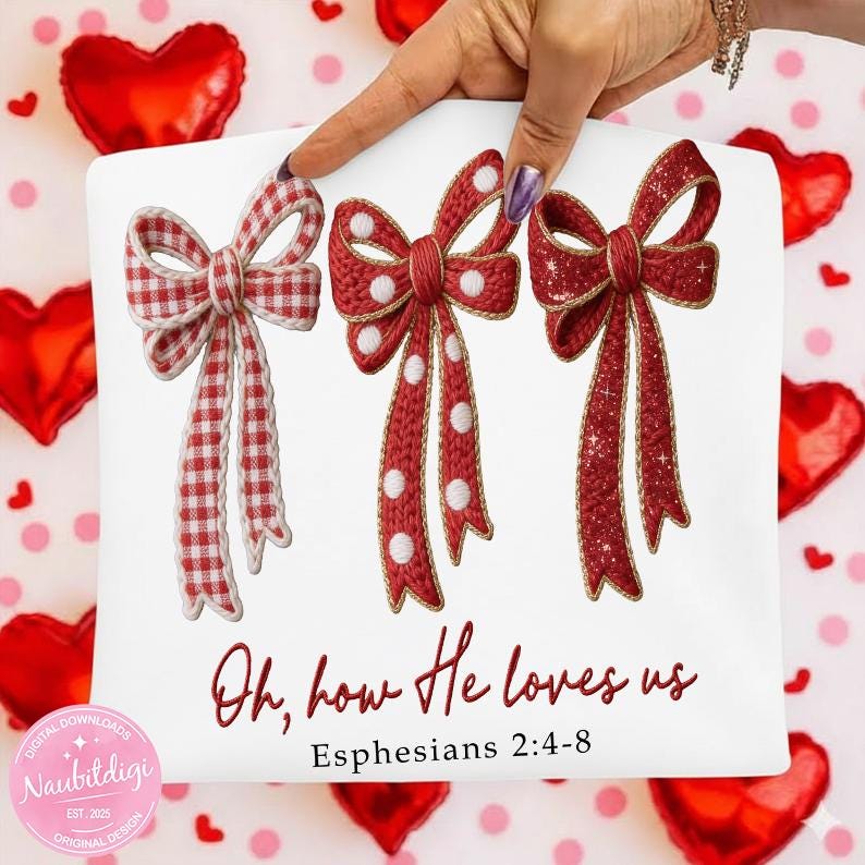 This artwork blends a cozy, handmade aesthetic with timeless Christian inspiration. The bows showcase a mix of gingham fabric, polka-dot embroidery, and subtle glitter-style stitching, creating a warm, premium, and faith-filled Valentine look. The typography is soft, flowing, and devotional, perfectly complementing the romantic yet reverent design.