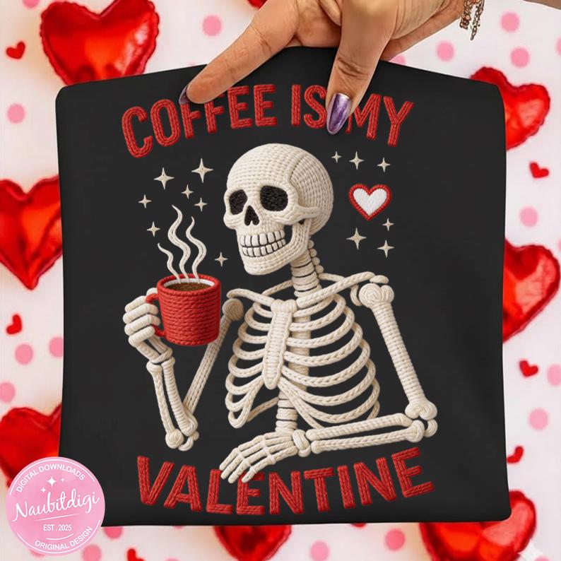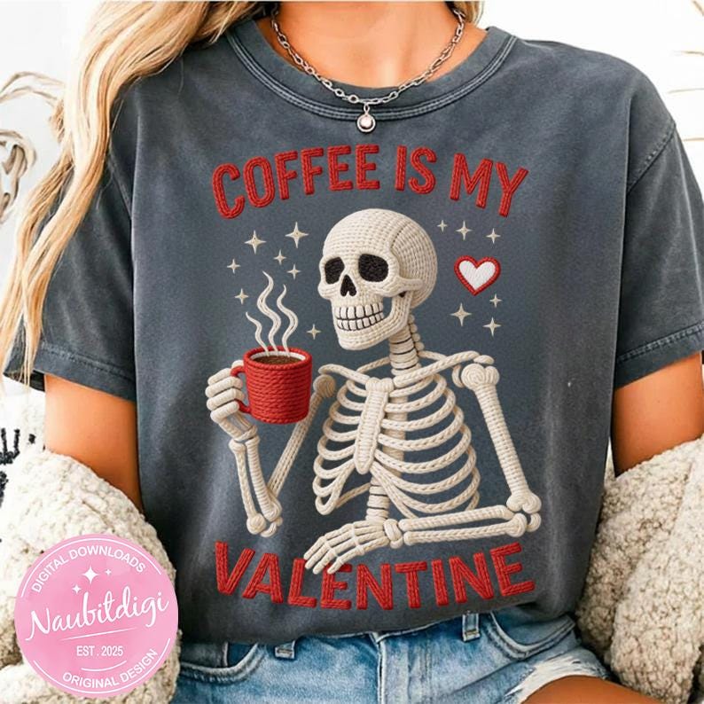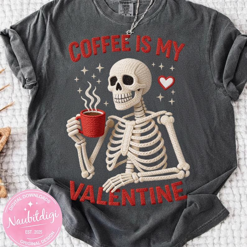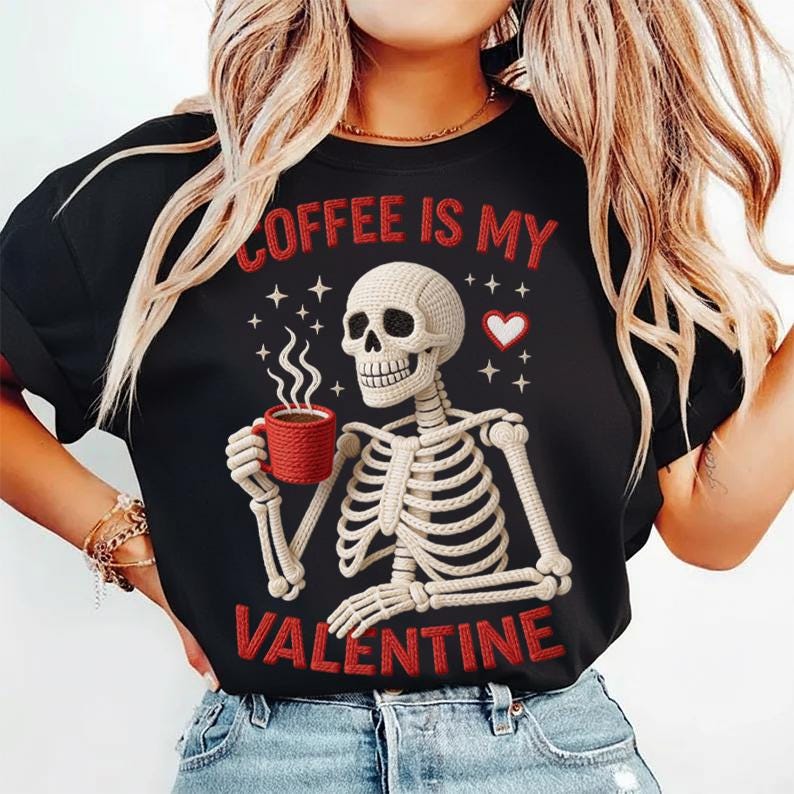 This spooky-cute skeleton coffee design features a cozy embroidered-style stitched look, perfect for Valentine’s Day apparel, gifts, and POD creations.