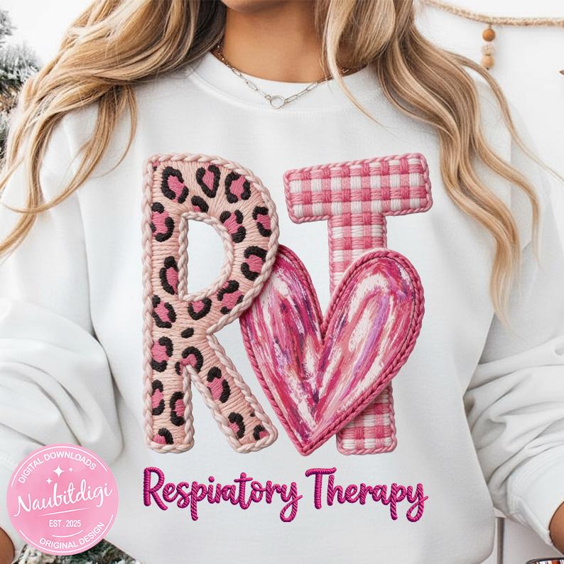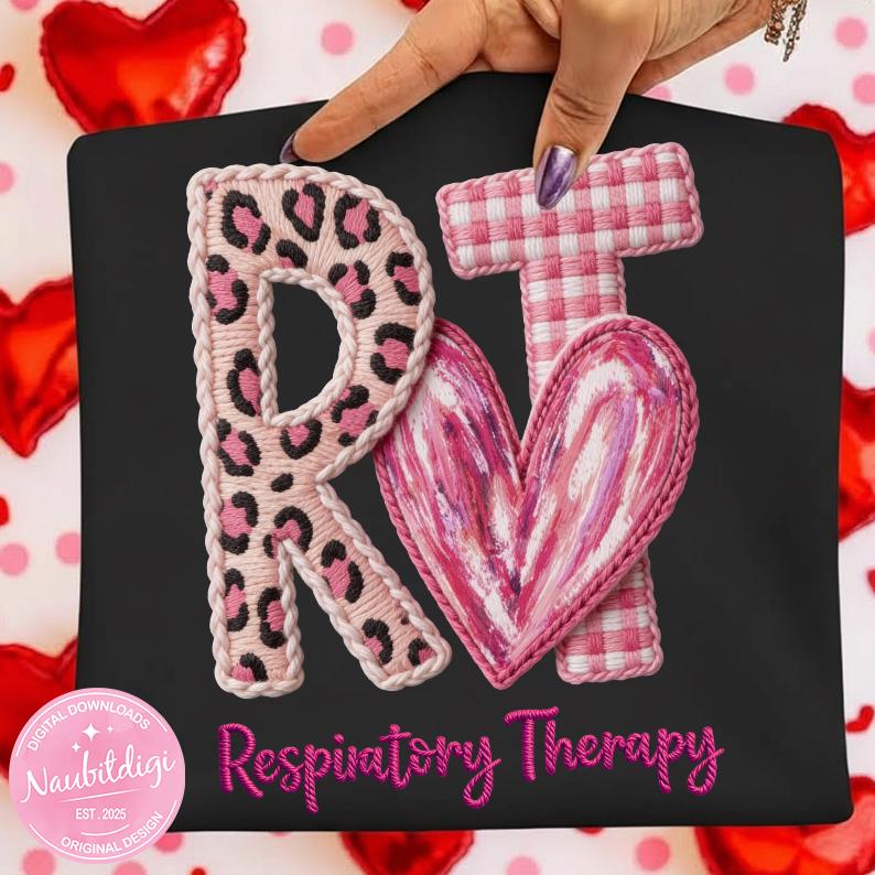 Celebrate respiratory therapists and healthcare heroes with this pink stitched-style digital design, featuring a heart-filled RN-inspired look with leopard and gingham textures. Perfect for creating heartfelt apparel and gifts with a cozy embroidered feel—no stitching required.