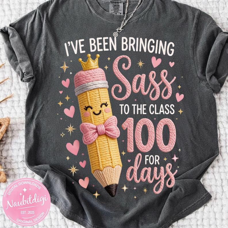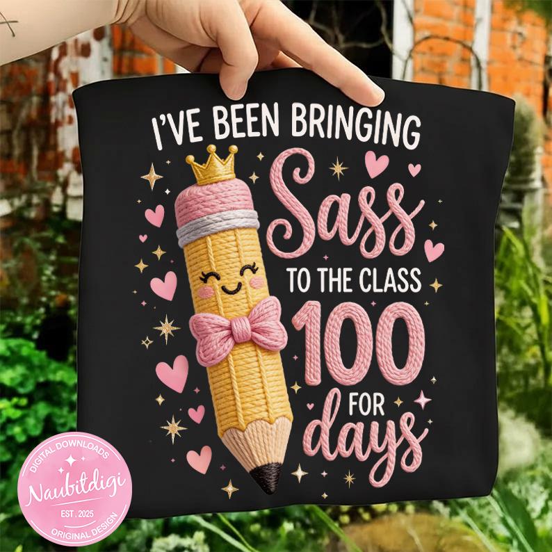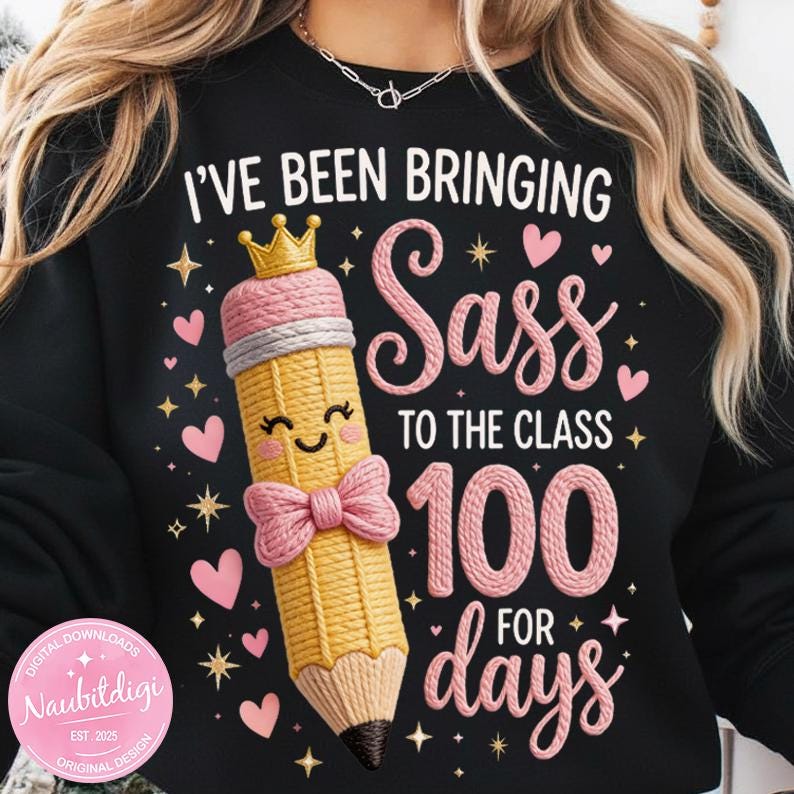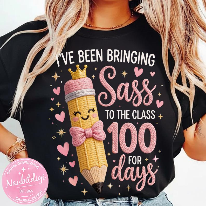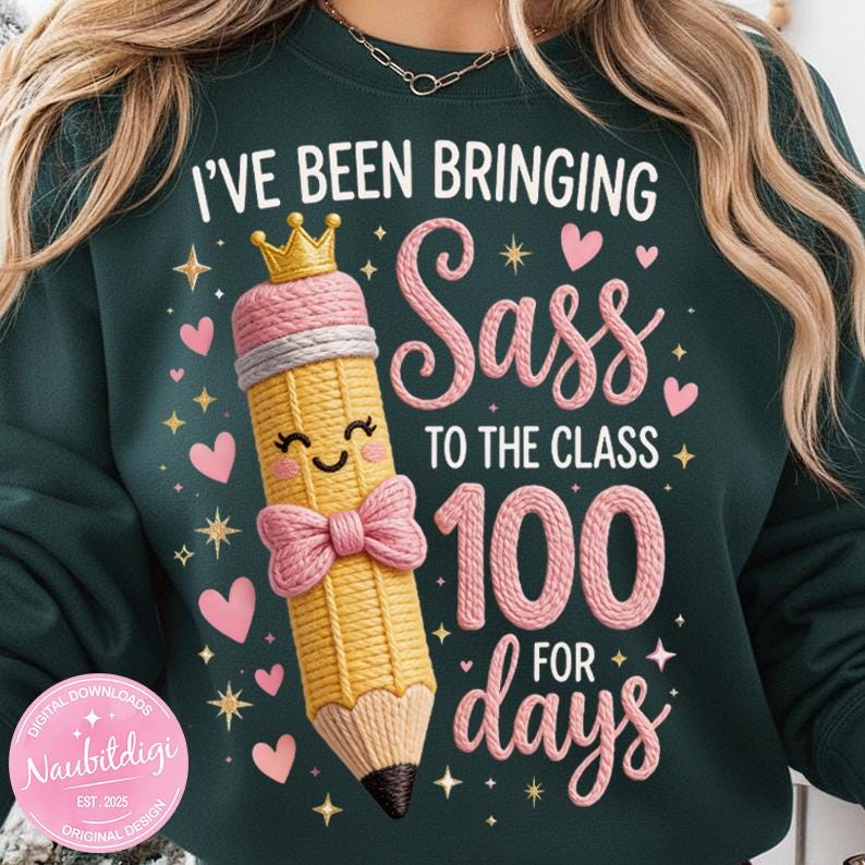 I’ve Been Bringing Sass to the Class 100 Days PNG, 100th Day of School Teacher Shirt Design, Cute Pencil Teacher PNG, Faux Embroidery