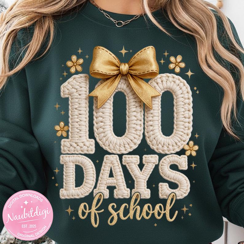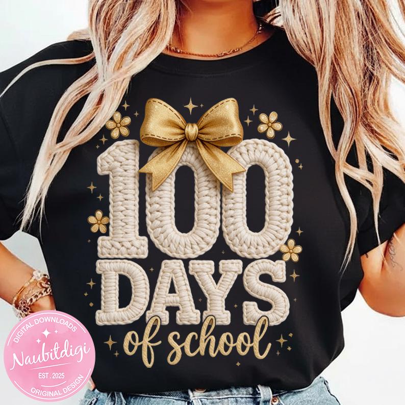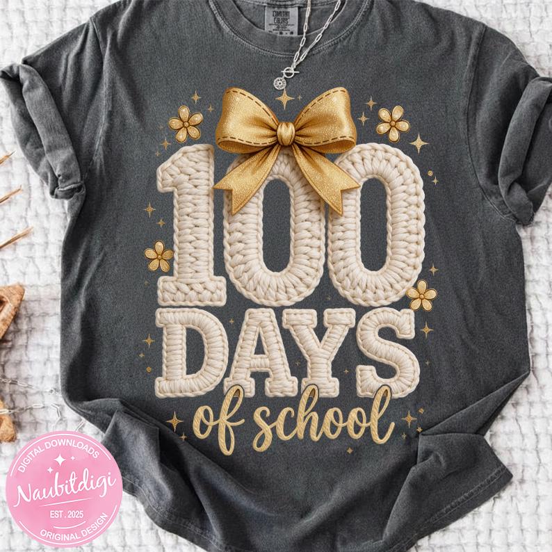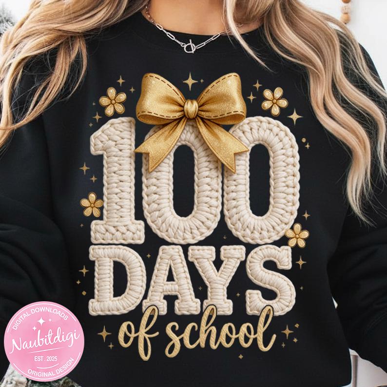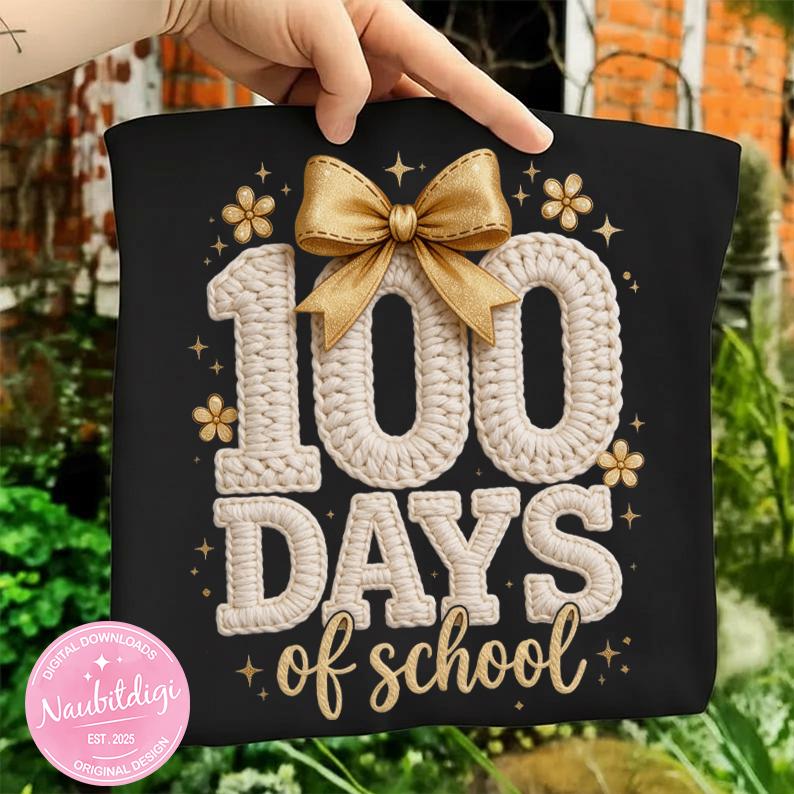 Celebrate the 100th day of school with this adorable faux knitted “100 Days of School” PNG design, featuring cozy textured lettering, a cute bow, and soft gold accents. Perfect for teachers, students, and classroom celebrations!