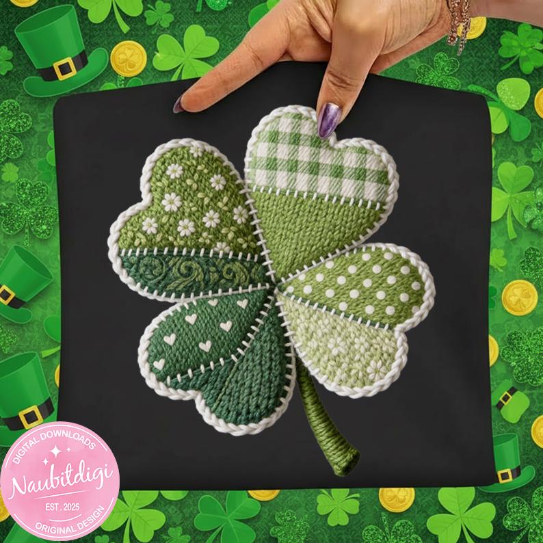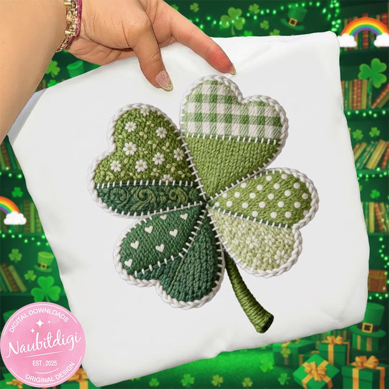 Designed with rich green tones and stitched details, this clover artwork delivers a warm, handcrafted look—without actual stitching—making it ideal for both print-on-demand and personal projects.