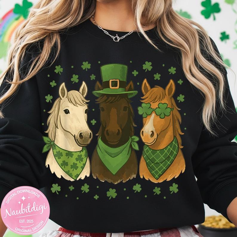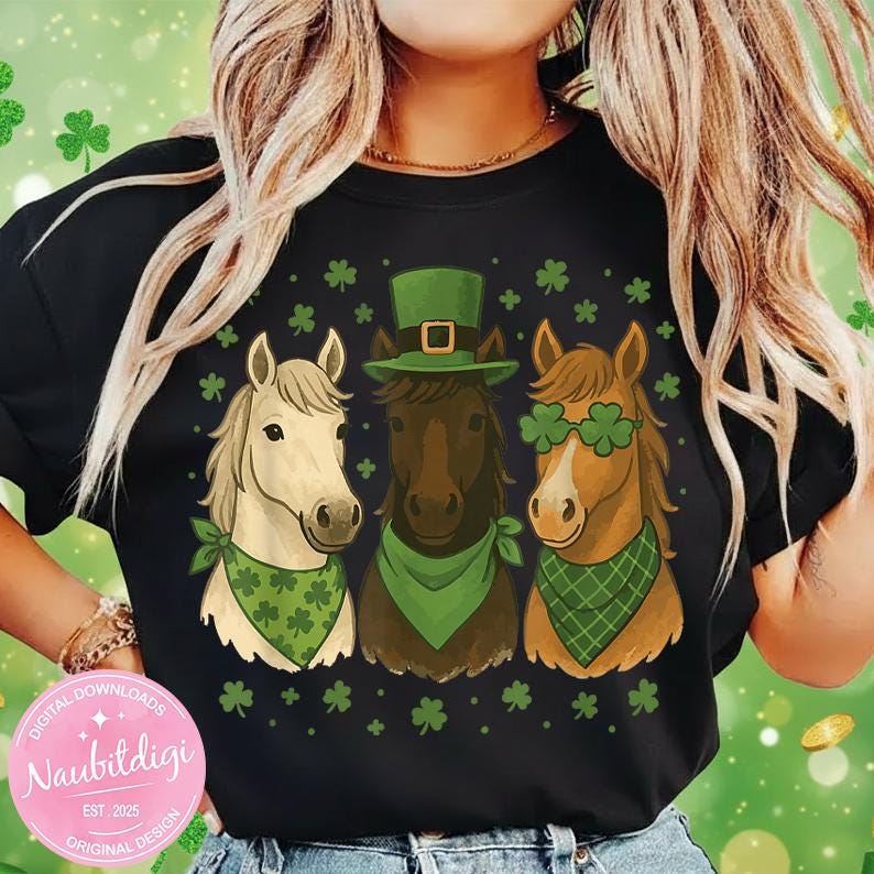Perfect for horse lovers, farm-themed outfits, and festive green apparel, this cute shamrock horse illustration is ready for shirts, hoodies, mugs, and more.