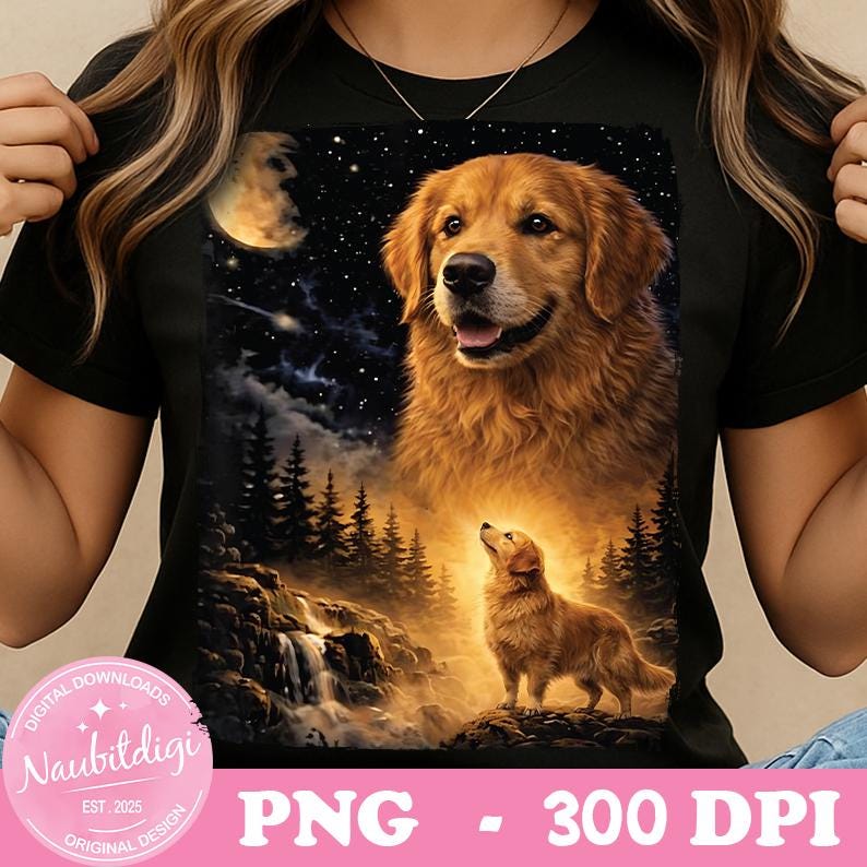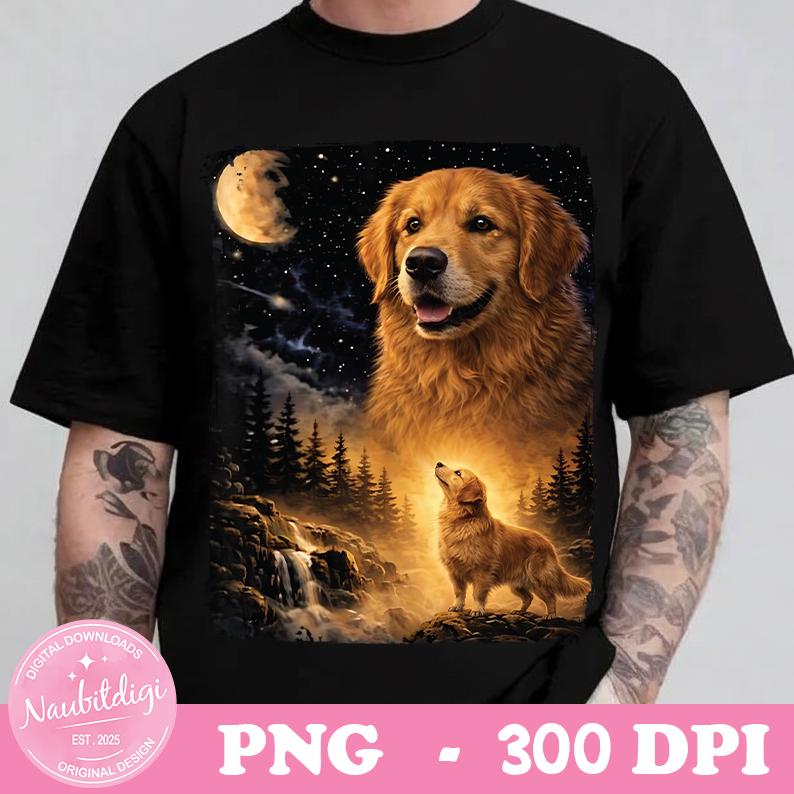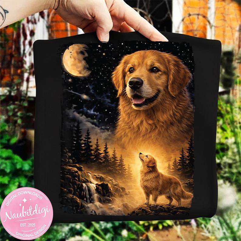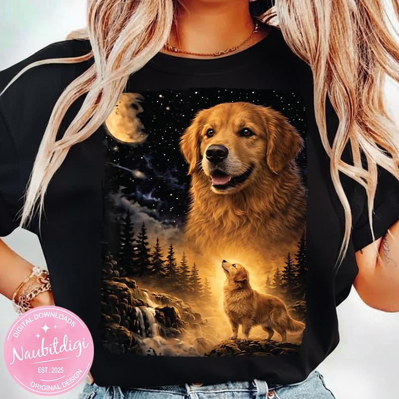 Bring warmth, loyalty, and a touch of magic to your next project with this stunning golden retriever night sky design. Featuring a glowing moon, star-filled sky, waterfall scene, and a radiant golden retriever, this artwork captures strength, love, and wonder.