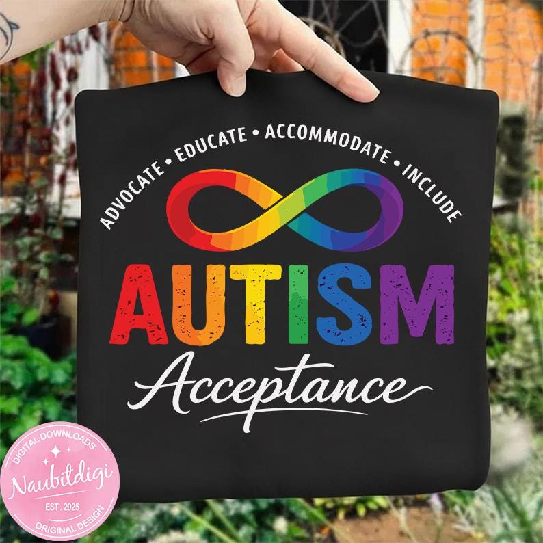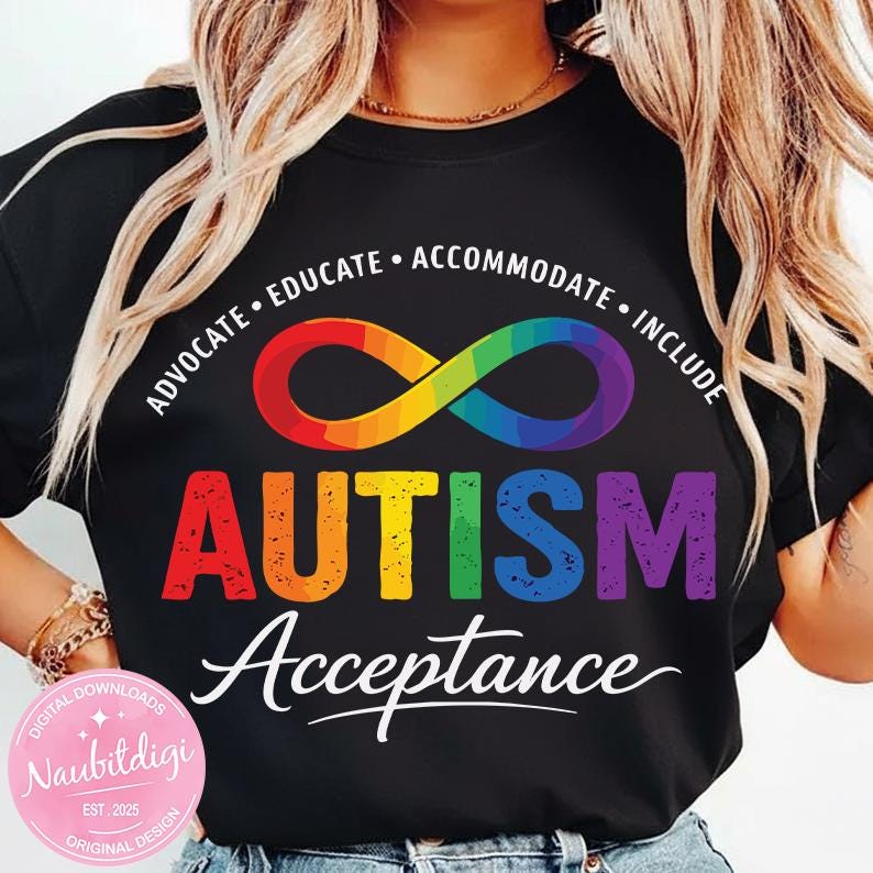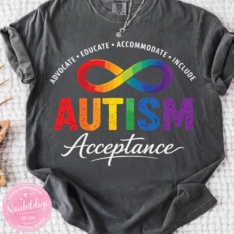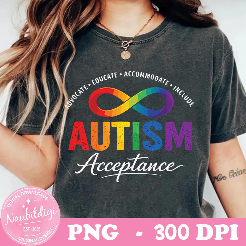Autism Awareness PNG – Rainbow Infinity Symbol Shirt Design – Advocate Educate Accommodate Include – Autism Acceptance Digital Download