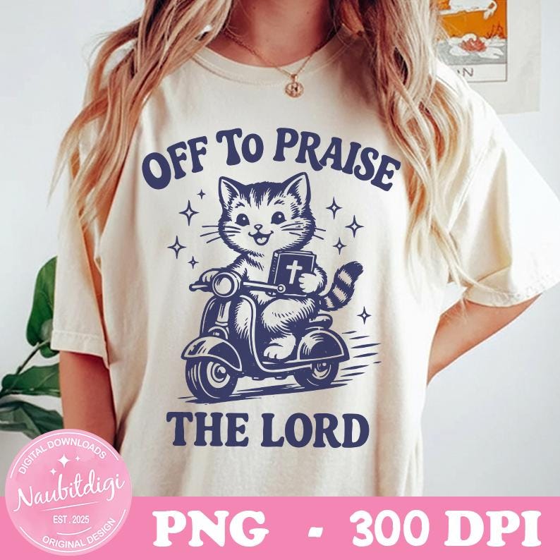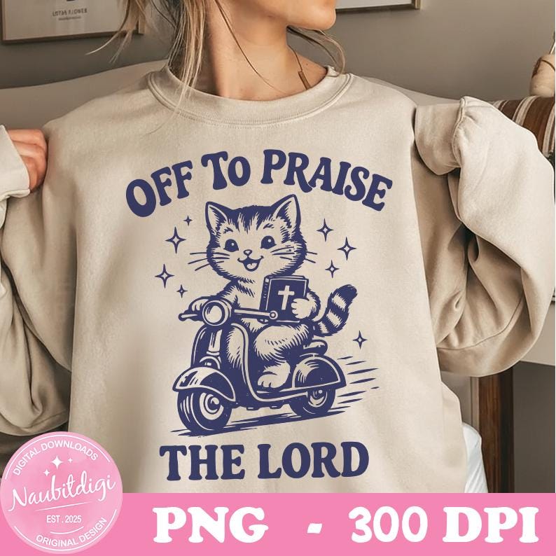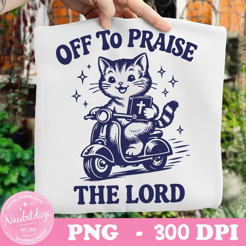 Off to Praise the Lord PNG, Funny Cat on Scooter with Bible, Christian Humor, Digital download